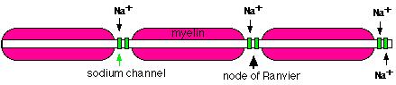 The axons of skeletal muscle motor neurons are encased in a fatty sheath called the ‘myelin sheath’ (it is actually the greatly expanded plasma membrane of an accessory cell called the ‘Schwann cell’). Where the sheath of one Schwann cell meets the next, the axon is unprotected. The voltage-gated sodium channels of myelinated neurons are confined to these spots (called ‘nodes of Ranvier’).