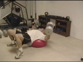 When doing dumbell presses (either on the ball or the bench), tilt the dumbells down and in…if the dumbells were pitchers or water, it would look like you’re pouring them on yourself.